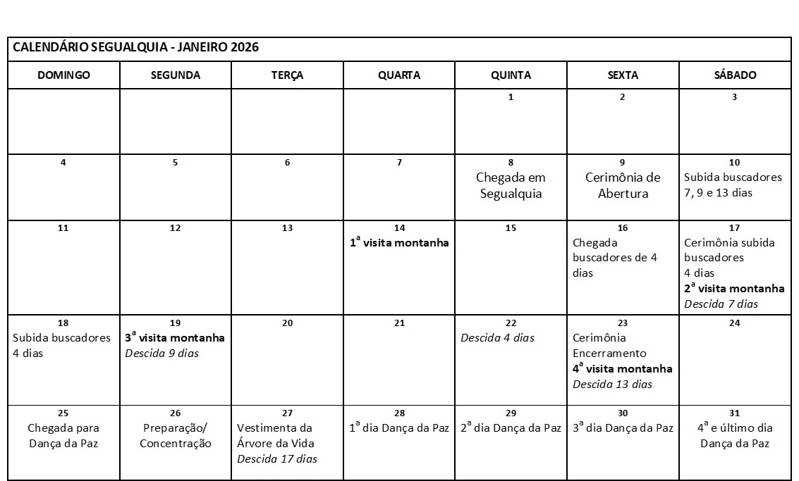 - 17 de jan/26 - Cerimônia subida buscadores de 4 dias, 2ª visita a montanha e descida buscadores de 7 dias